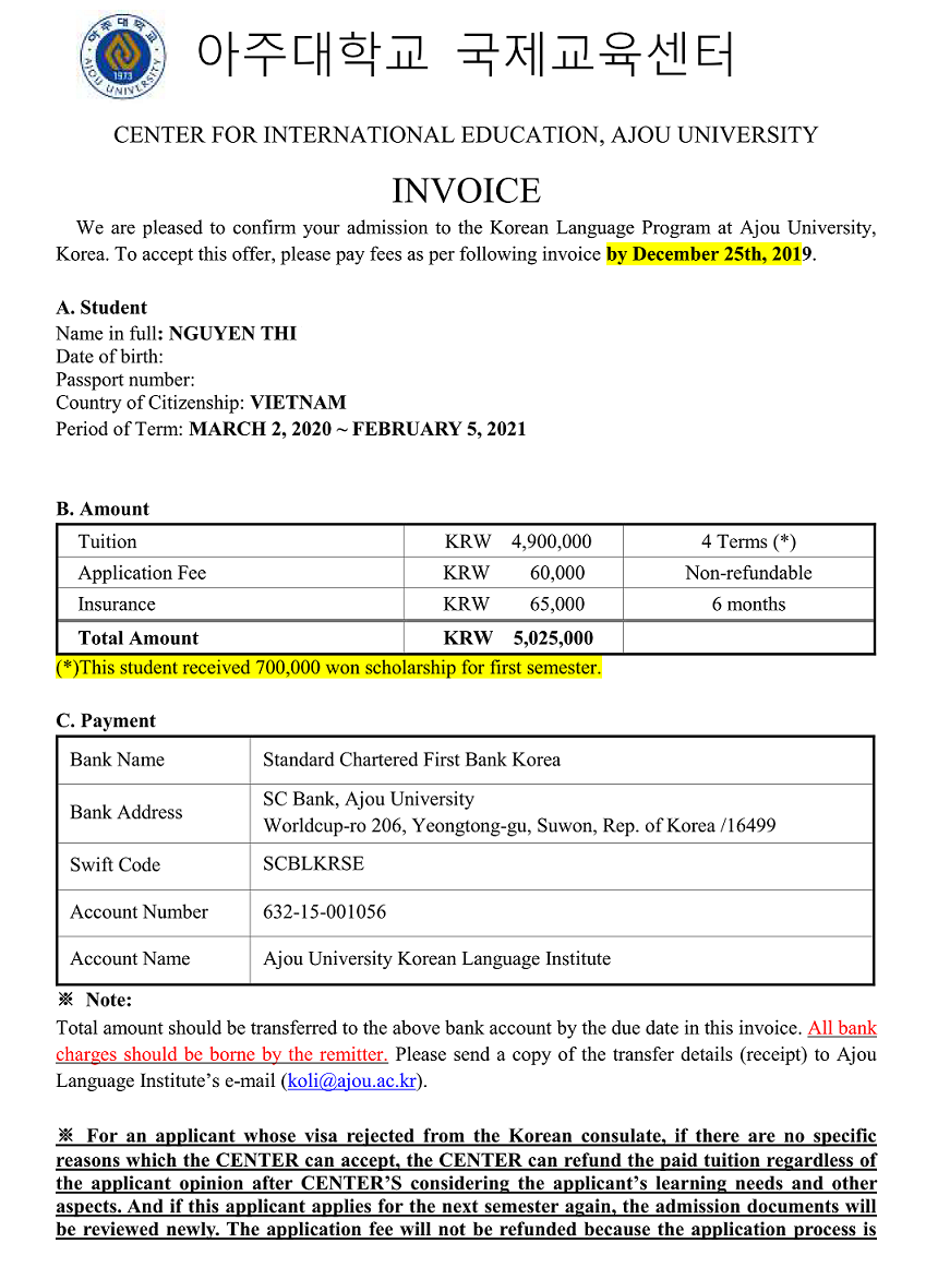 - Học bổng khóa tiếng của trường Đại học Ajou: Giảm 700,000 KRW ⇒ Học phí khóa tiếng: 4,900,000 KRW/1 năm